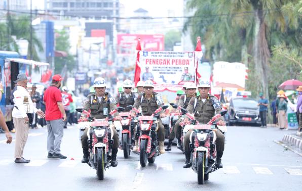 Mengusung tema Pengawalan Penegakan Perda, Sat Pol PP menerjunkan dua unit roda empat dan tujuh unit kendaraan roda dua yang dihias warna merah putih dengan berbagai aksesoris.